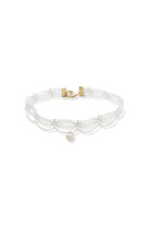 It's artfully crafted with synthetic white seed pearls arranged in a fetching lace-like design, topped off with a faux pearl pendant that swings from a chic golden chain.